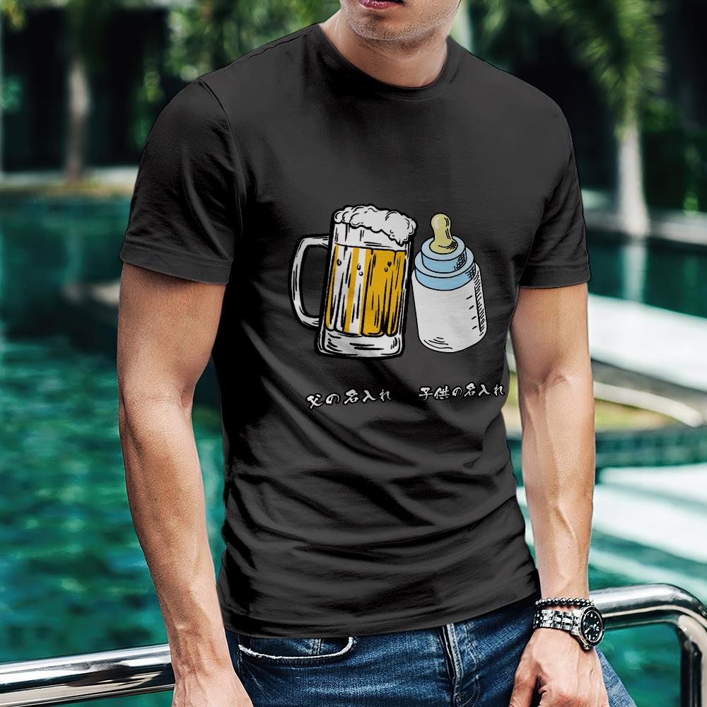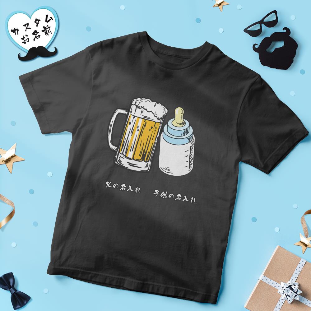 カスタム名前Tシャツ - テキスト入れ可能なT-SHIRTギフト父の日プレゼント - ビールジョッキと哺乳瓶かんぱい