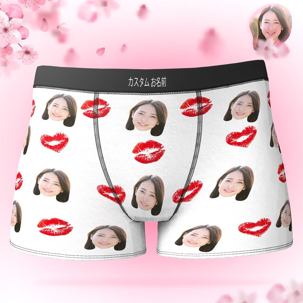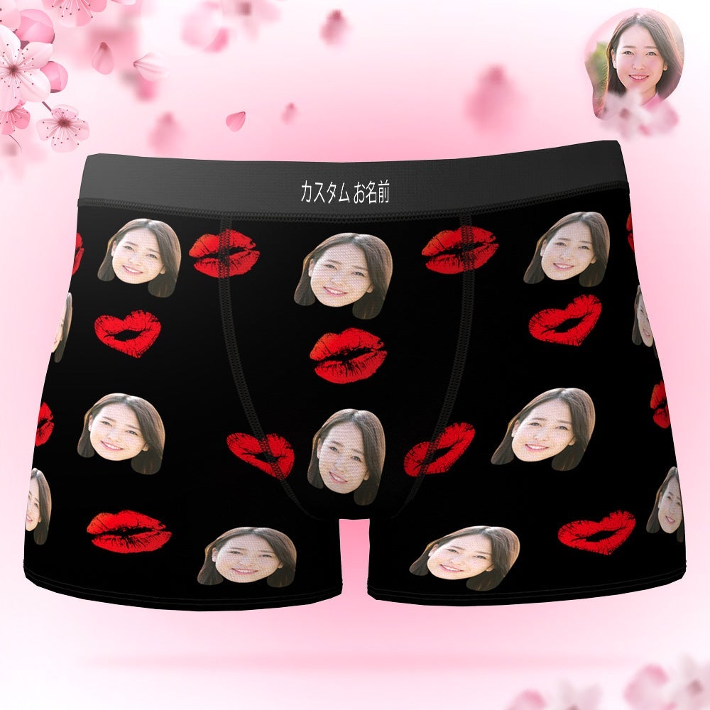 カスタムフォトボクサーパンツ-写真とテキスト入り可能なセクシーなハート形の唇柄の下着彼氏や旦那へのバレンタインギフト