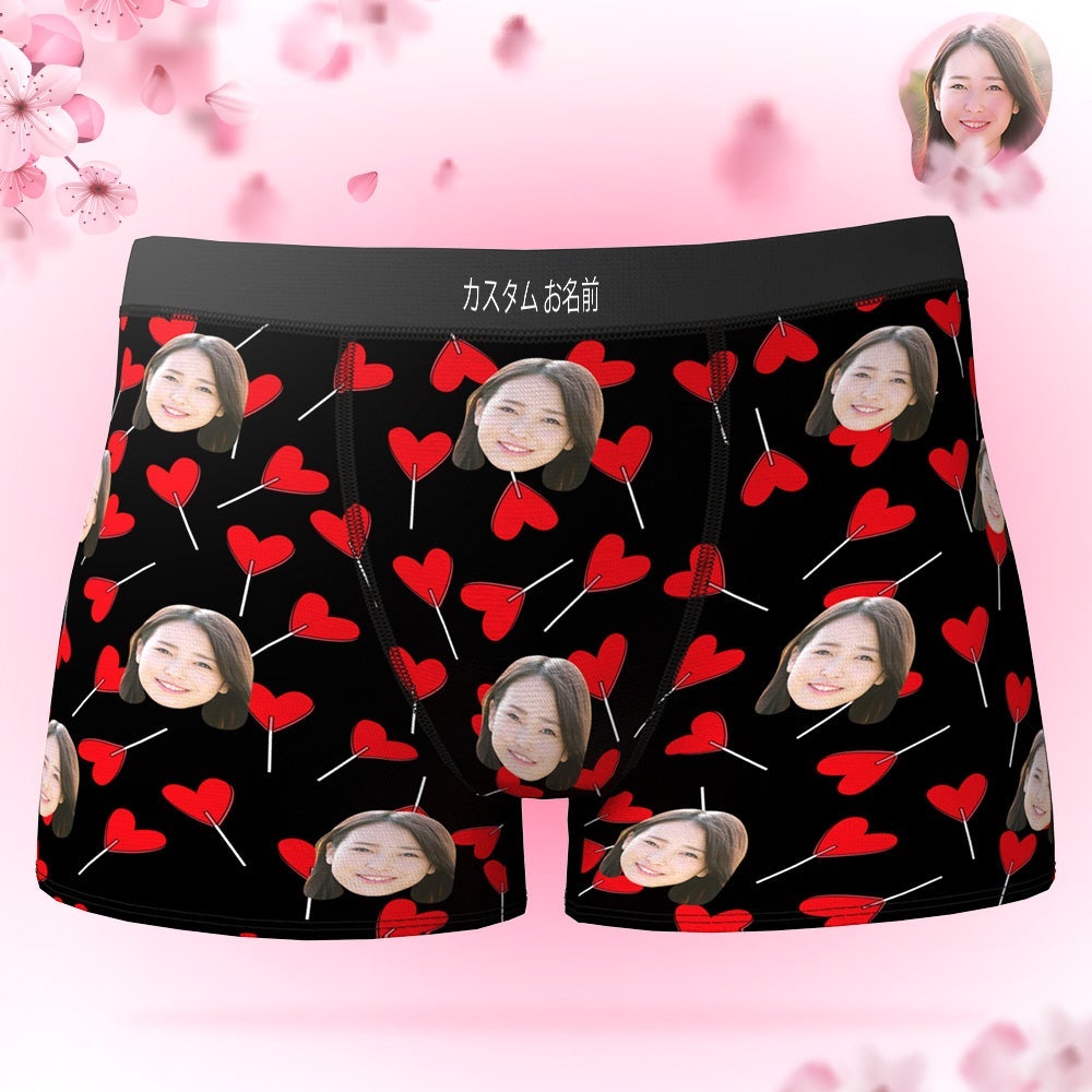 カスタムフォトボクサーパンツ-写真と名入れ可能なオリジナルバレンタイン顔下着ショーツギフト-ハート柄