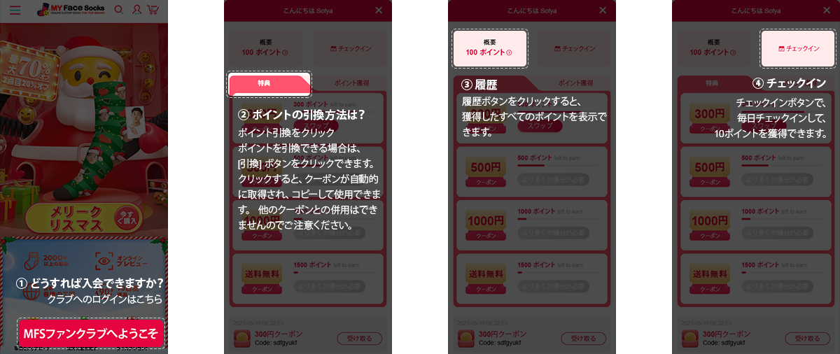 MFS クラブ は myfacesocks.jp のロイヤルティプログラムで、買い物をするたびに特典がもらえます! 新規のお客様は、無料でアカウントを作成して参加できます。