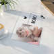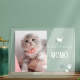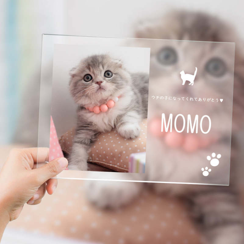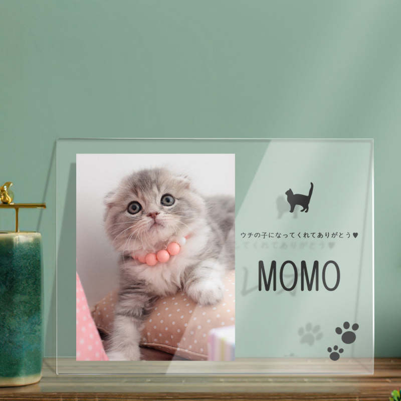 カスタムフォトアクリル製写真立て‐ネコの写真と名前とメッセージ入れ可能なメモリーを込めった卓上ペットグッズプラーク-肉球柄横向き