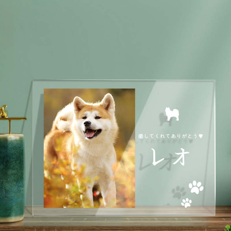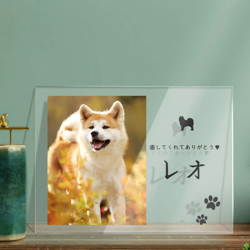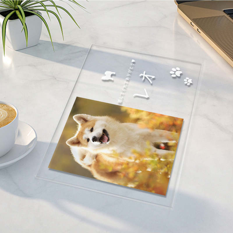 カスタムフォトアクリル製写真立て‐愛犬の写真と名前とメッセージ入れ可能なメモリーを込めった卓上ペットグッズプラーク-肉球柄横向き