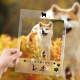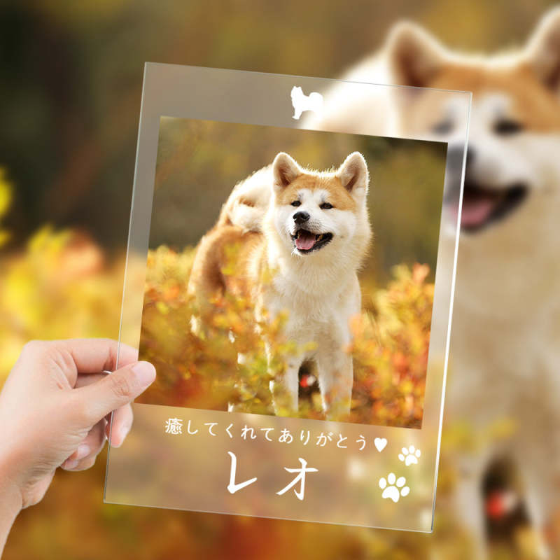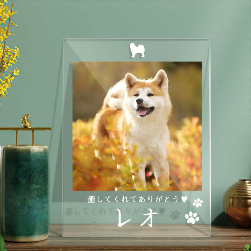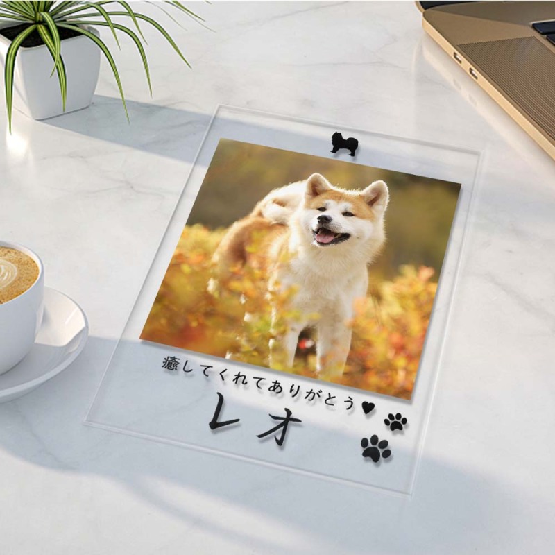 カスタムフォトアクリル製写真立て‐愛犬の写真と名前とメッセージ入れ可能なメモリーを込めった卓上ペットグッズプラーク-肉球柄縦向き