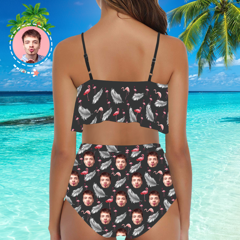 カスタムフェイスビキニ-レディースフリルサマービキニ-ハイウエスト水着ギフト彼女へ-フェザー&フラミンゴ