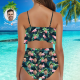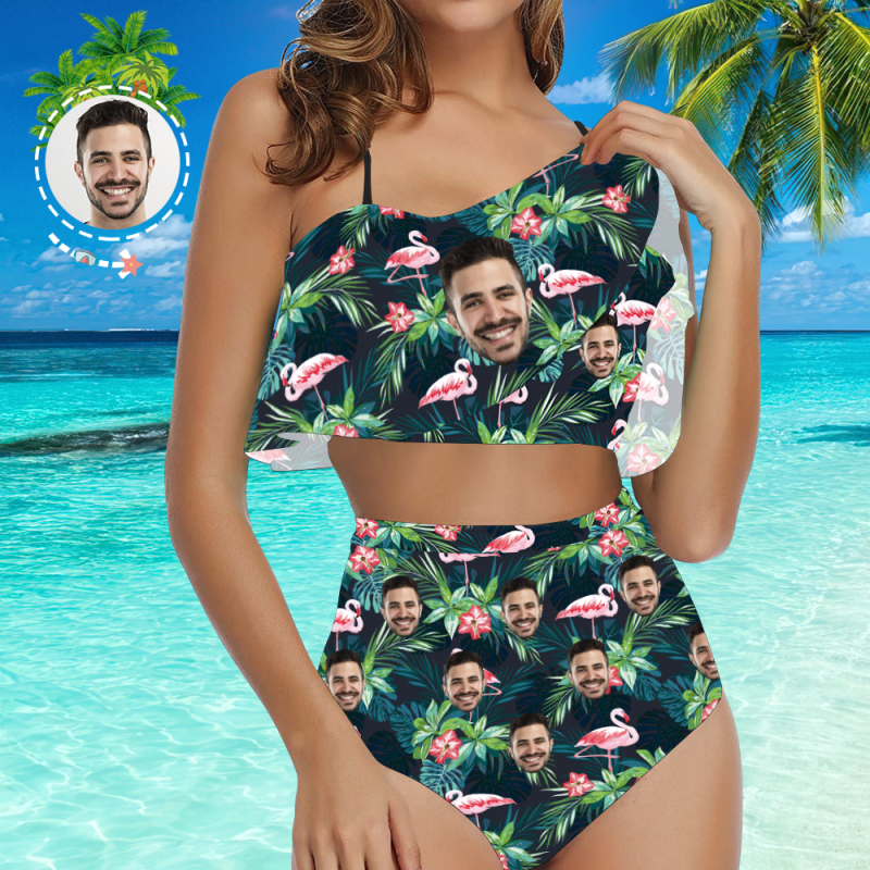 カスタムフェイスビキニ-レディースフリルサマービキニ-ハイウエスト水着ギフト彼女へ-葉とフラミンゴ