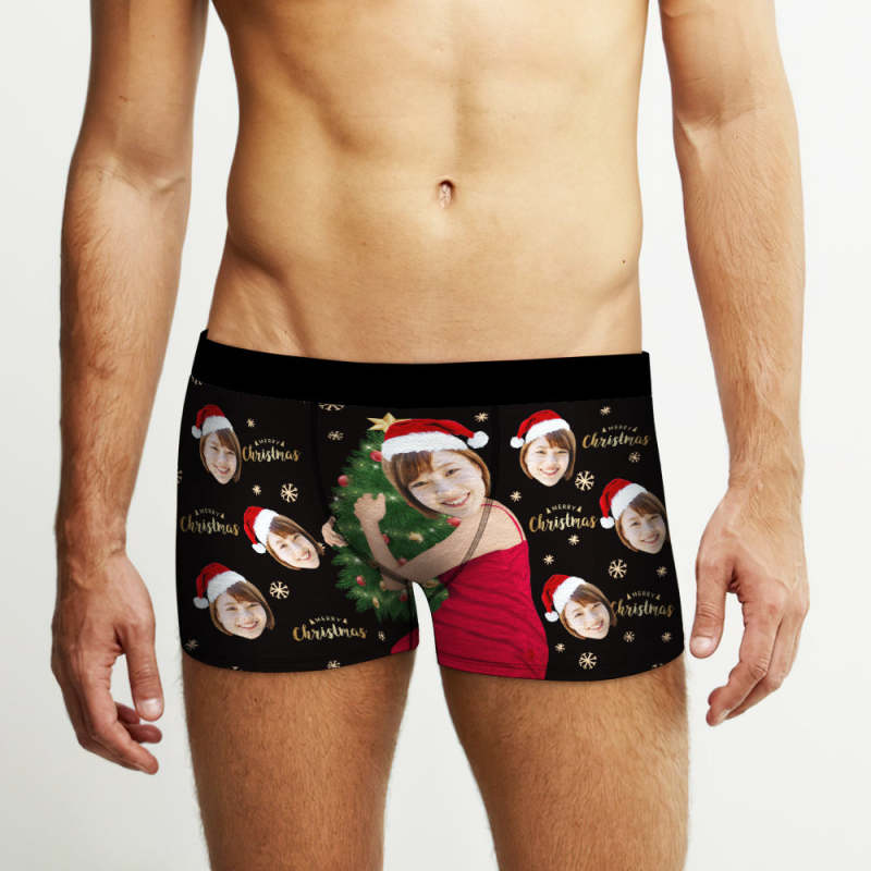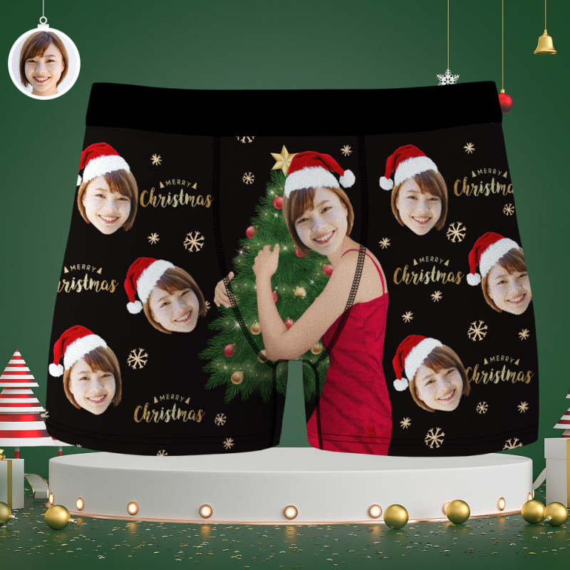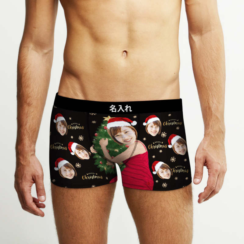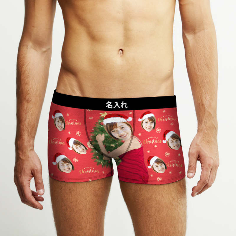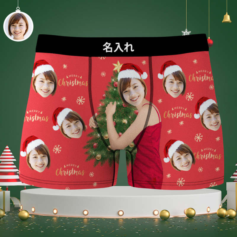 カスタム顔ボクサーパンツ-顔の写真入れ可能なオリジナルフォト下着ショーツクリスマスギフト-クリスマスツリーメリークリスマス