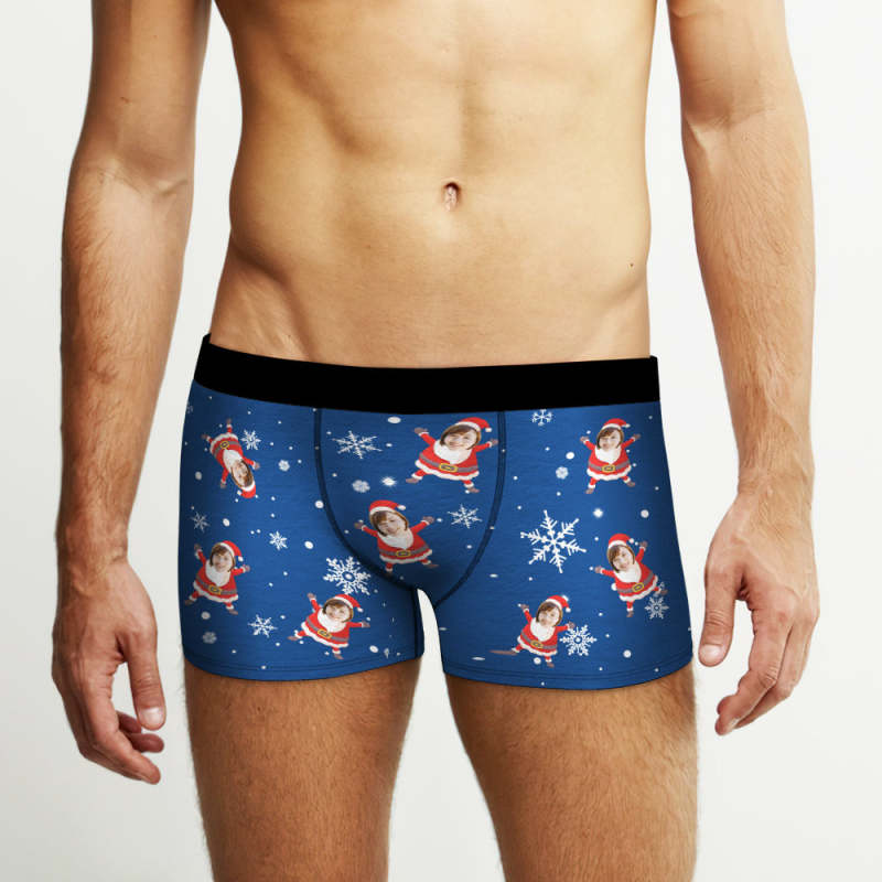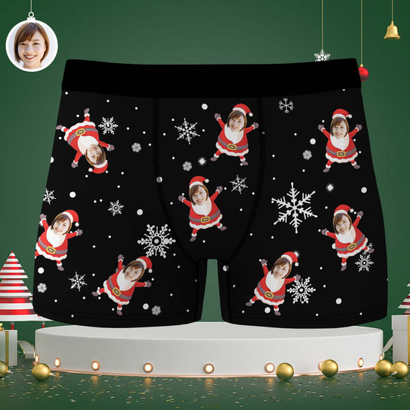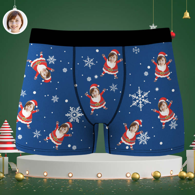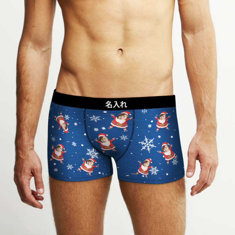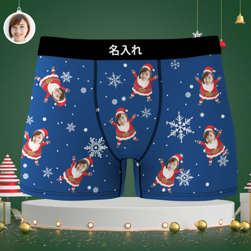 カスタム顔ボクサーパンツ-顔の写真入れ可能なオリジナルフォト下着ショーツクリスマスギフト-雪柄と可愛いサンタ