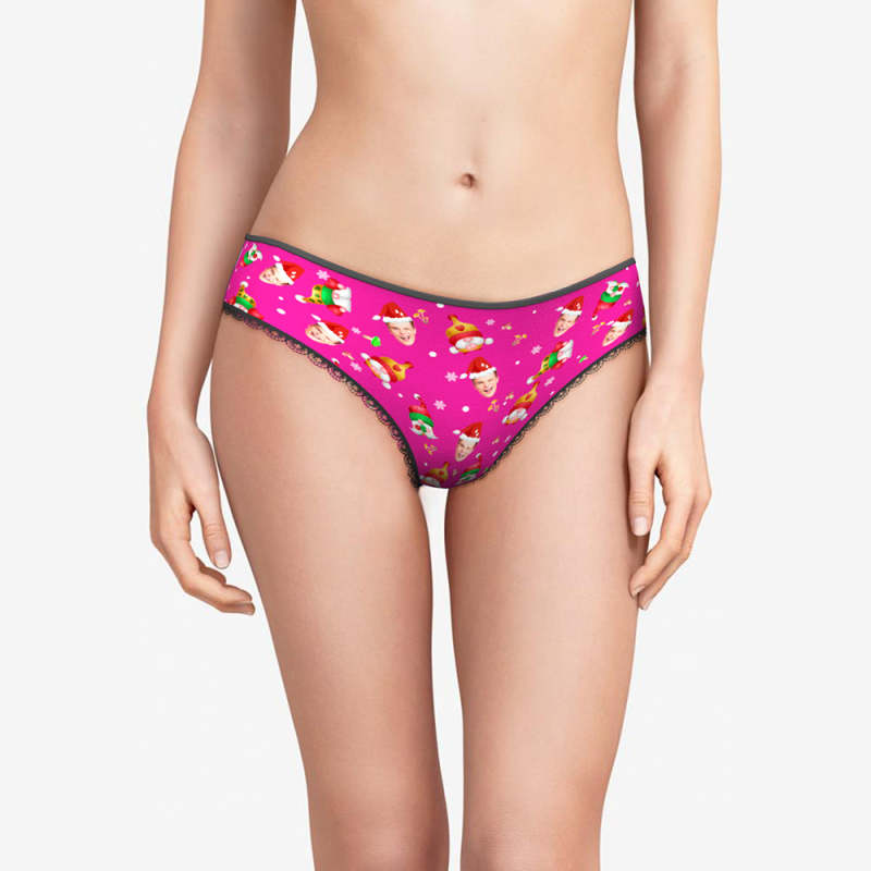 カスタムフォトパンティー-写真入れ可能なハッピーノーム柄のクリスマスピンクの女性用パンティーショーツギフト