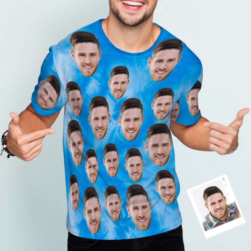 オーダーメイド男性用顔Tシャツ-顔の写真入れ可能な面白い絞り染めTシャツ-ブルー