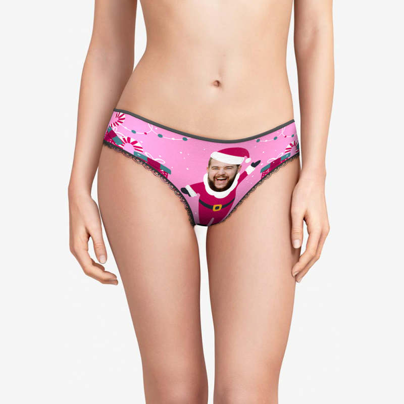 カスタムフォトパンティー-写真入れ可能なサンタクロースのプレゼント柄のクリスマスピンクの女性用パンティーショーツギフト