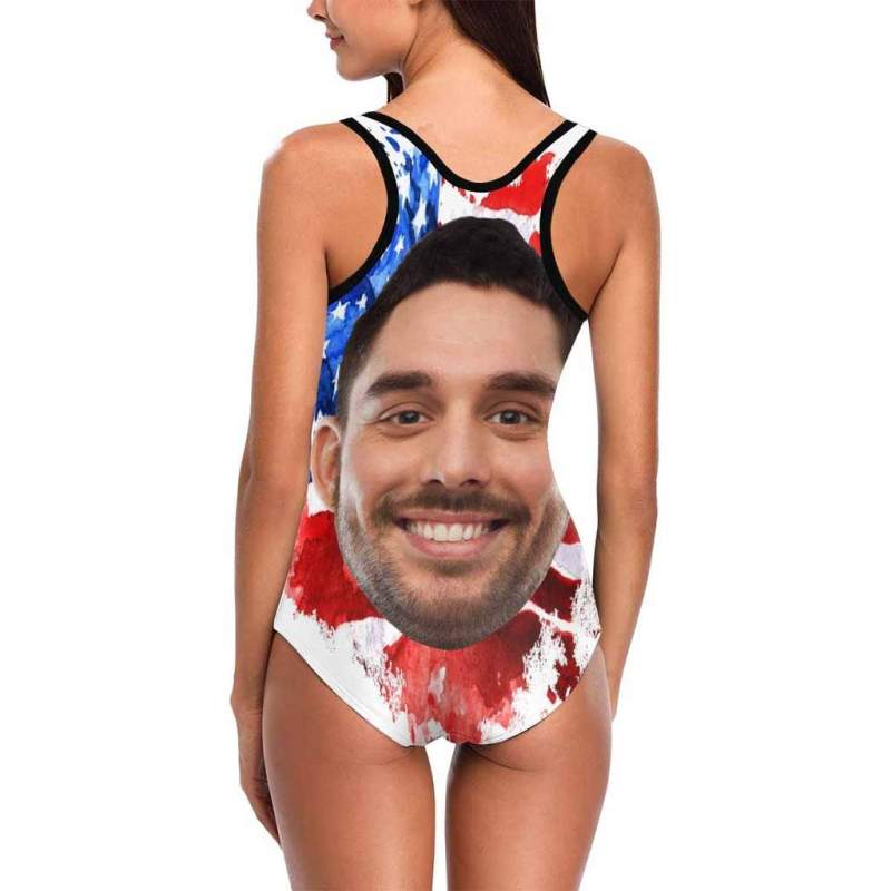 カスタムフェイス水着‐レディースフォトサスペンダーワンピースタンクトップ水着-芸術的なアメリカ国旗
