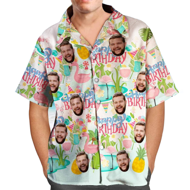 カスタムフェイスハワイアンシャツ - 写真入れ可能なオリジナルアロハシャツ - フラミンゴ誕生日おめでとう
