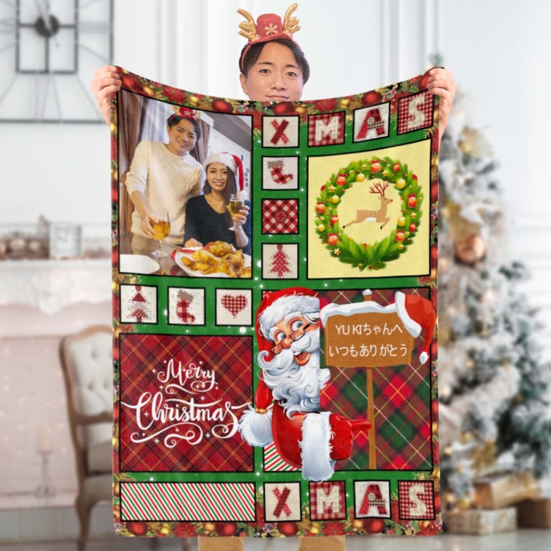 カスタムフォトブランケット-写真入れテキスト入れ可能なサンタクロース柄のフリース毛布クリスマスひざかけギフト
