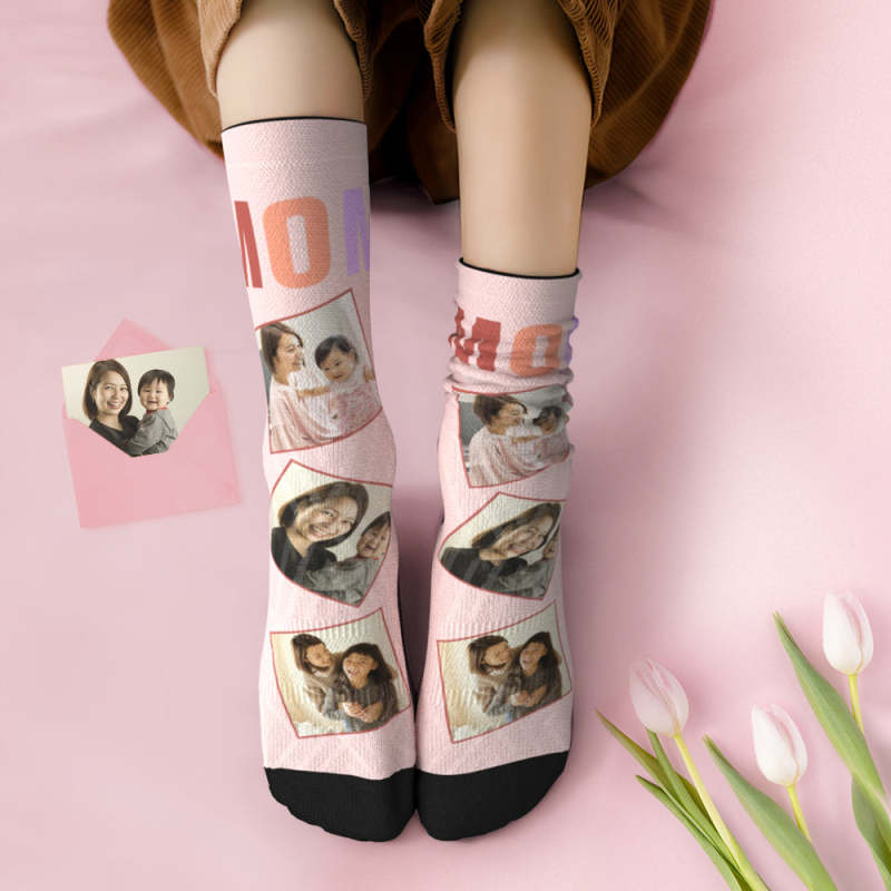 カスタムフォトソックス-写真3枚入れ可能な母の日の靴下プレゼント-MOM