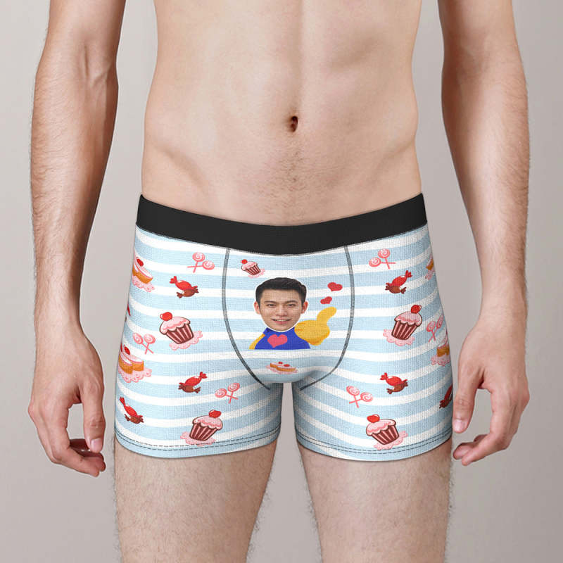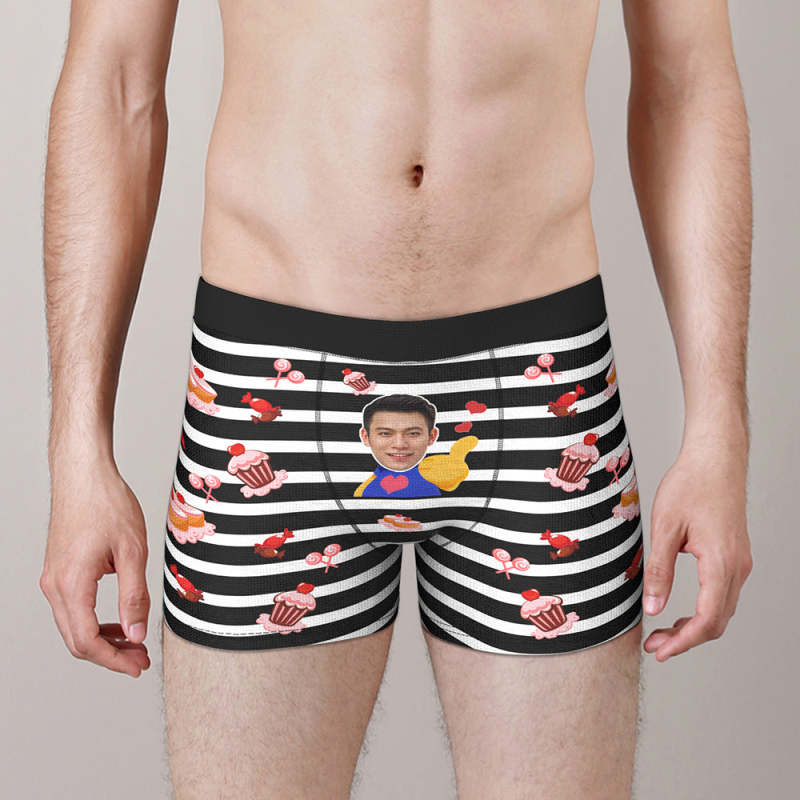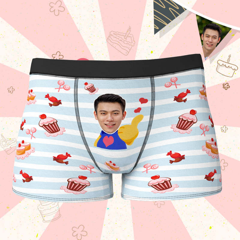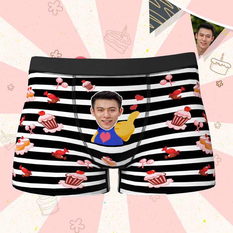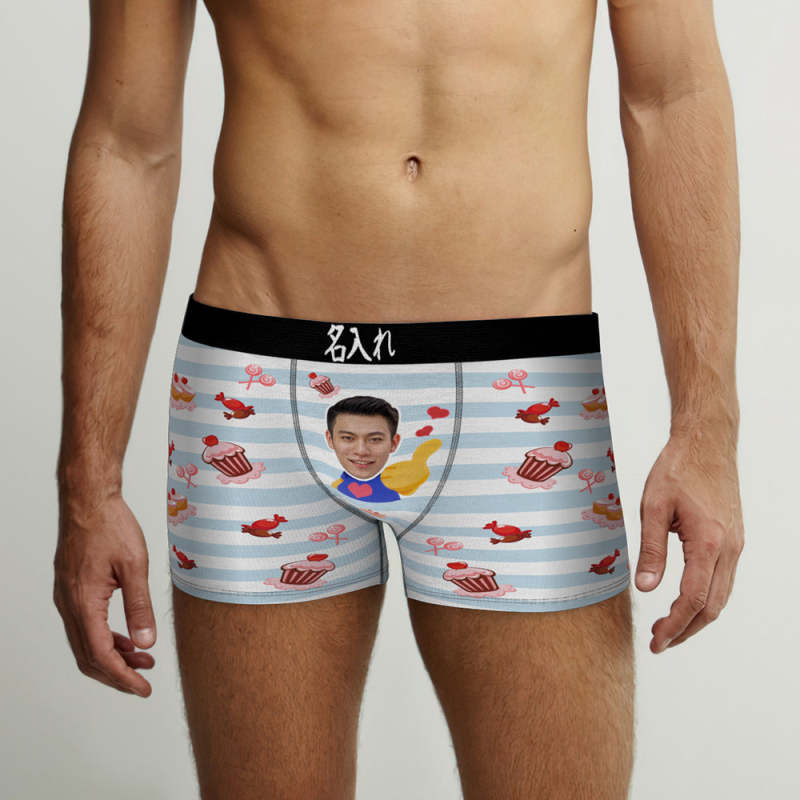 カスタムフォトボクサーパンツ-写真とテキスト入れ可能な誕生日下着縞とケーキ柄