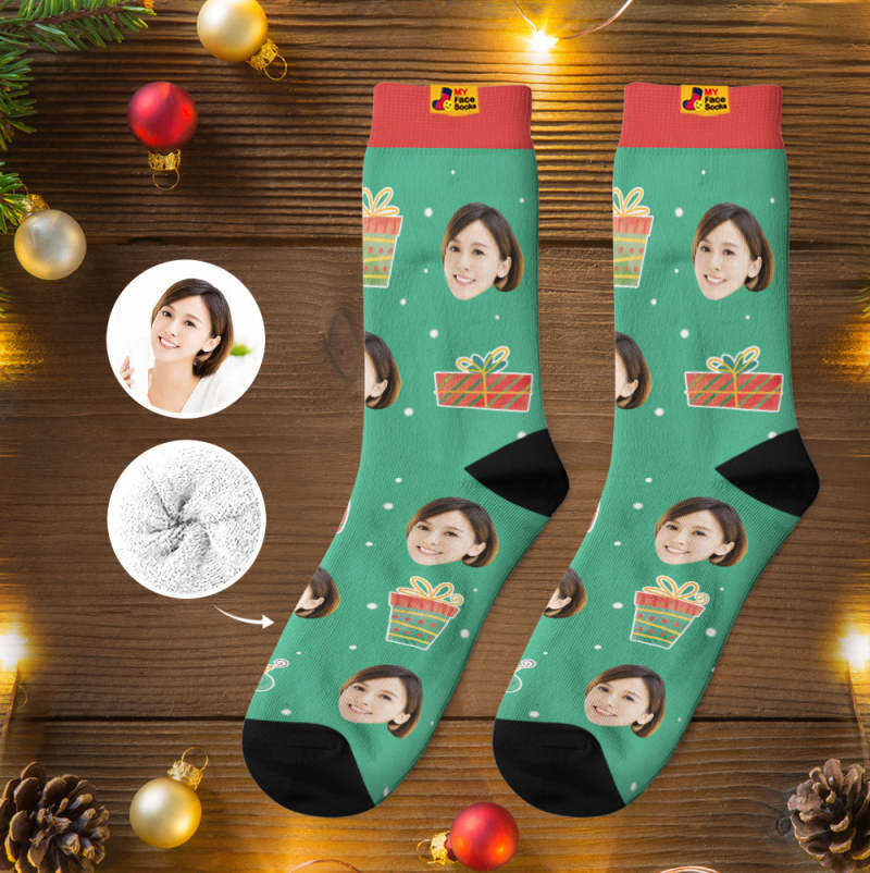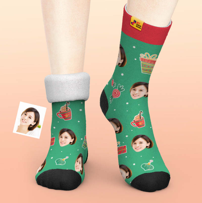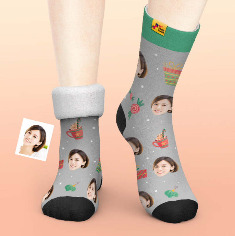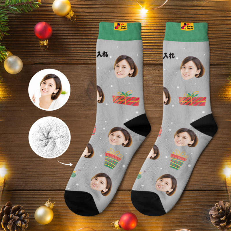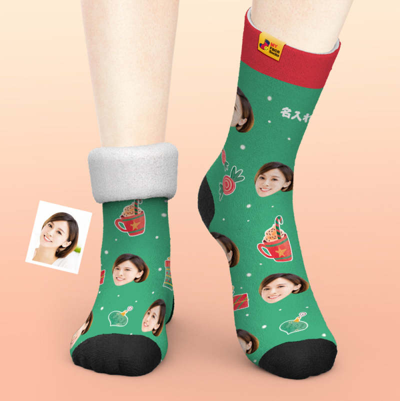 カスタム厚手フェイスソックス-写真入れ名入れ可能なオリジナル秋冬用暖かいクリスマス靴下プレゼント-お菓子プレゼント柄