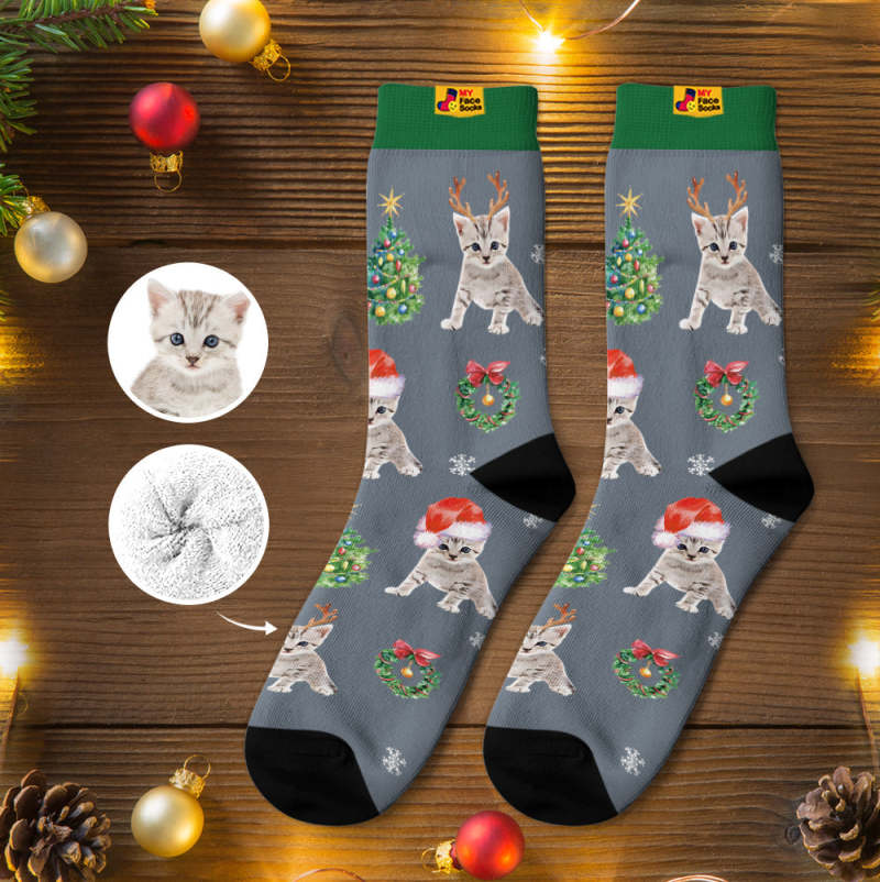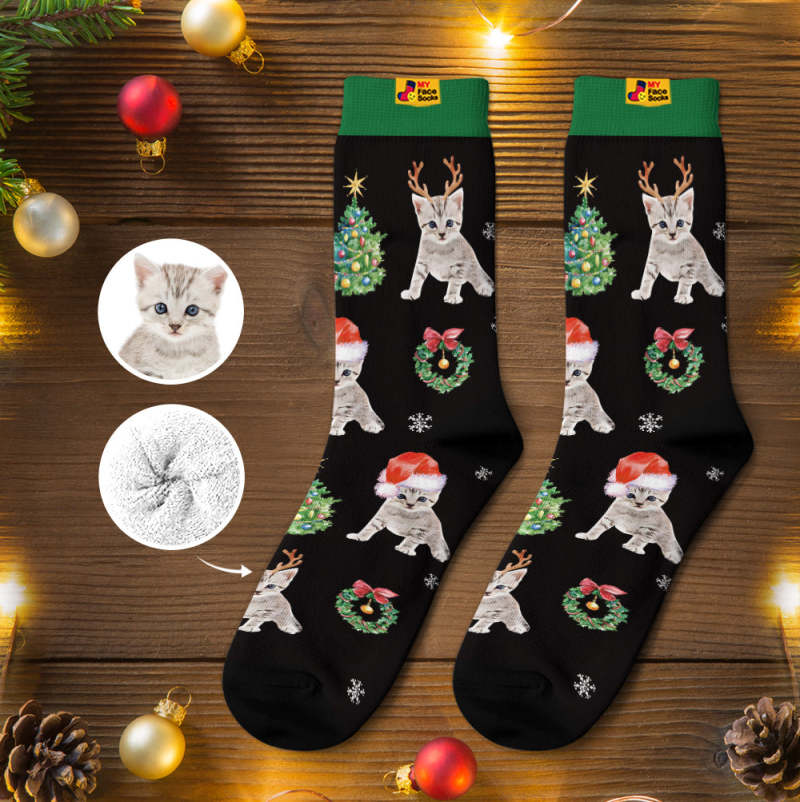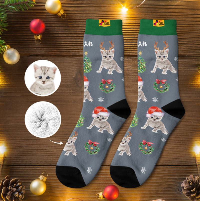 カスタム厚手フェイスソックス-写真入れ名入れ可能なオリジナル秋冬用暖かいクリスマス靴下プレゼント-サンタ帽子をかぶったかわいいネコ