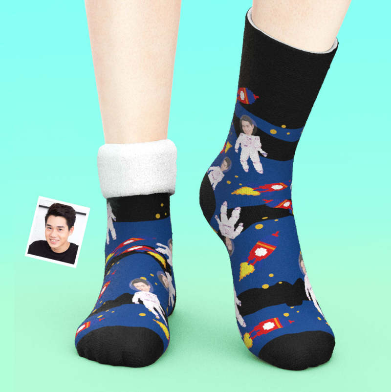 カスタム厚手フェイスソックス-写真入れ名入れ可能な面白い宇宙飛行士とロケット柄のオリジナル秋冬用暖かい靴下プレゼント