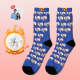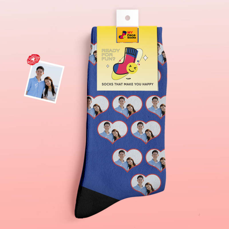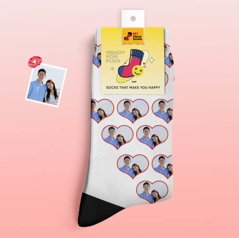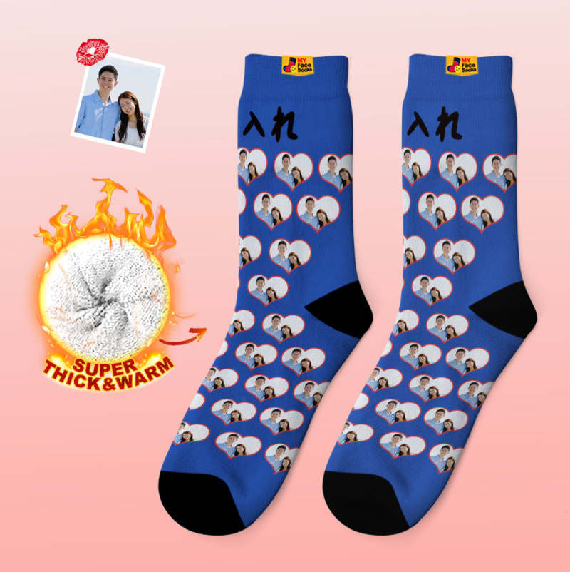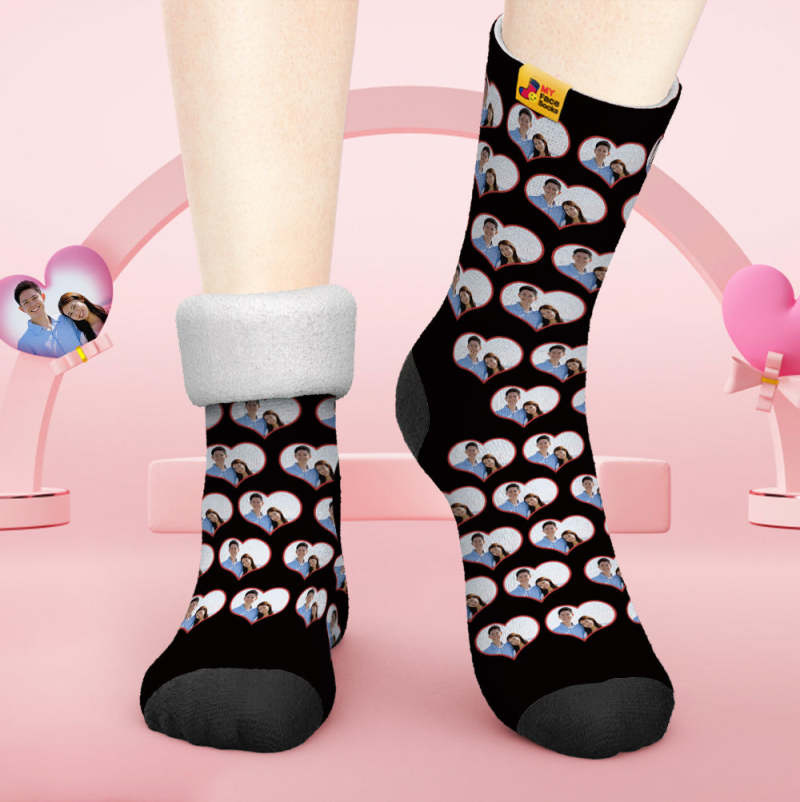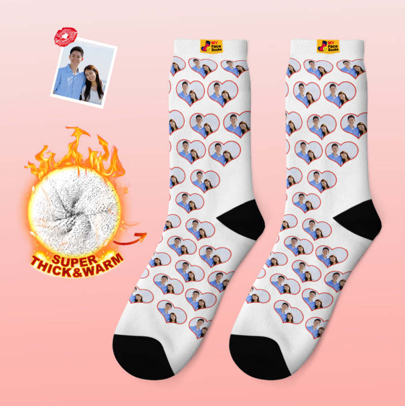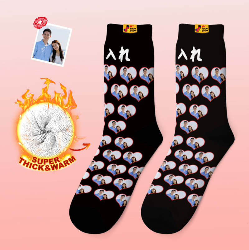 カスタム厚手フェイスソックス-写真入れ名入れ可能なオリジナル秋冬用暖かいバレンタイン靴下プレゼント-ハート形写真だらけ柄