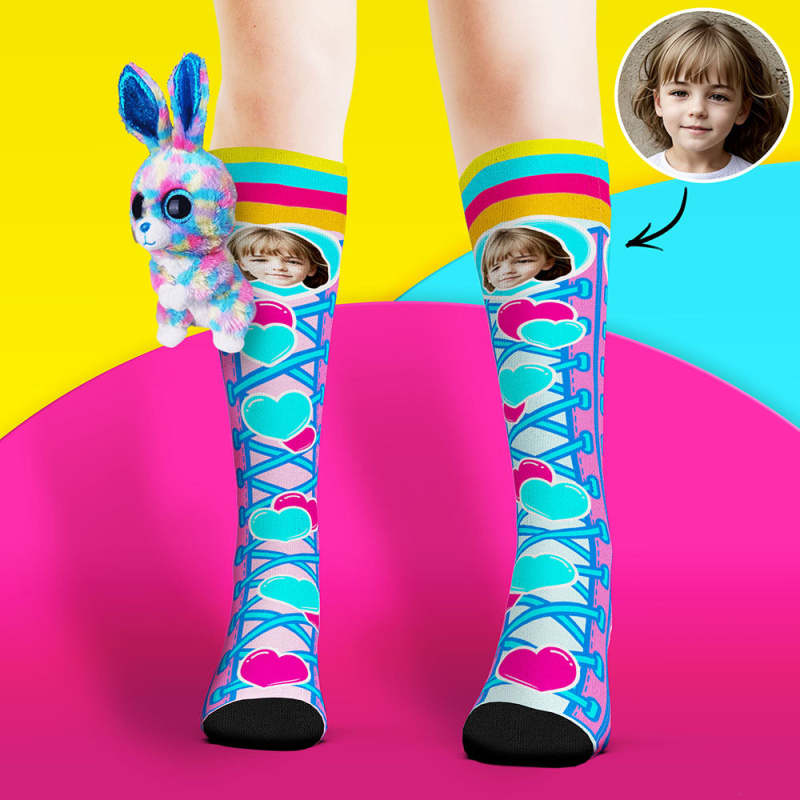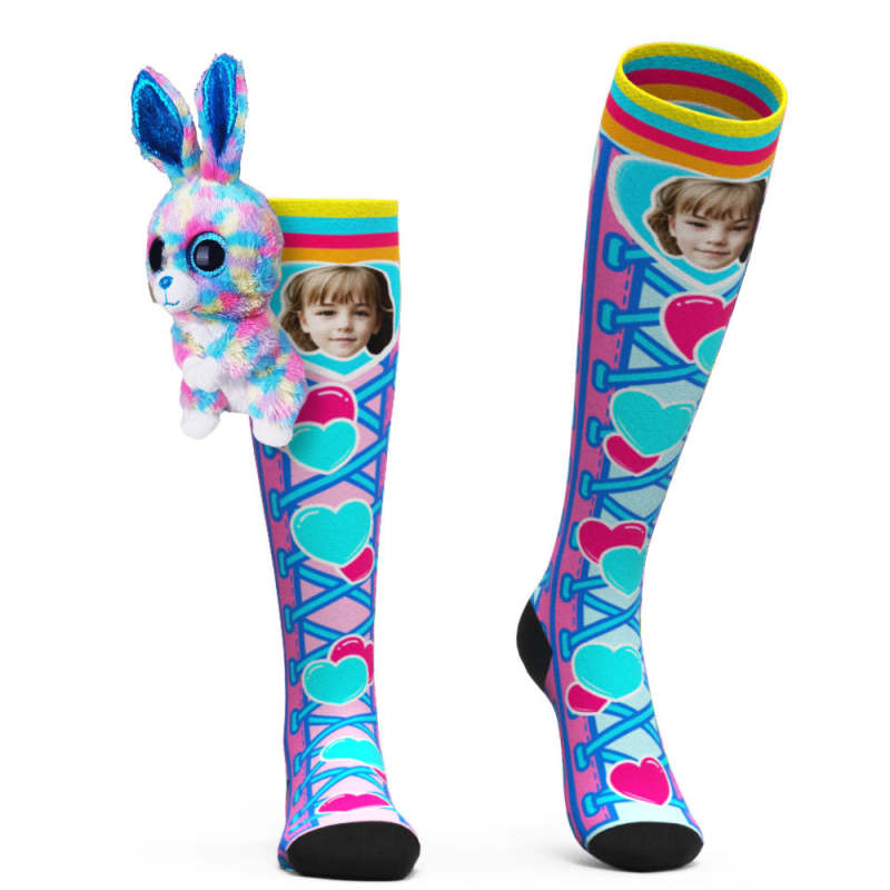 カスタム可愛い写真靴下-ニーハイフェイスソックスウサギ人形の青いハート柄の靴下