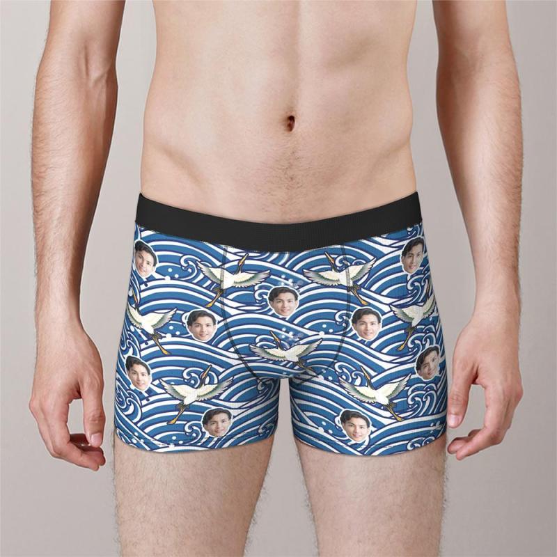 カスタムフォトボクサーパンツ-写真入り可能な鹤と波柄下着父さんや彼氏への新年のプレゼント