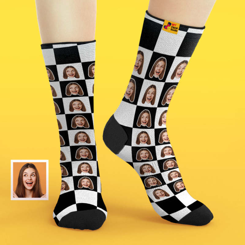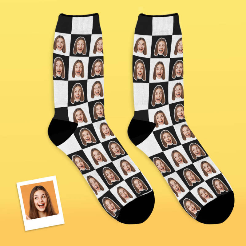 カスタム通気性フェイスソックス - 写真入れ可能なオリジナル靴下 - 黒白のチェック柄